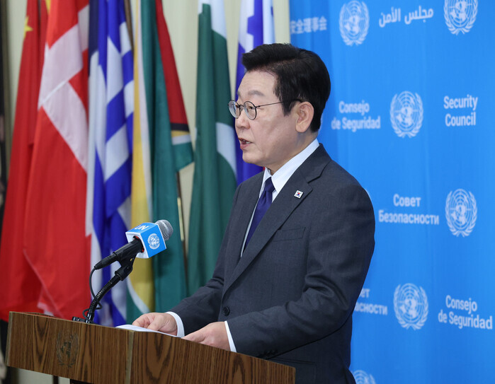 | ▲ 이재명 대통령이 24일(현지시간) 미국 뉴욕 유엔본부에서 안전보장이사회 공개 토의에 앞서 약식 브리핑을 하고 있다. 2025.9.25 (사진=연합뉴스) |