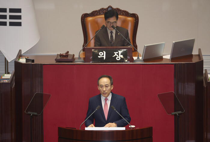 존경하는 국민 여러분, 우원식 국회의장과 동료 의원 여러분, 한덕수 국무총리와 국무위원 여러분, 대구 달성군 출신 국민의힘 원내대표 추경호입니다.