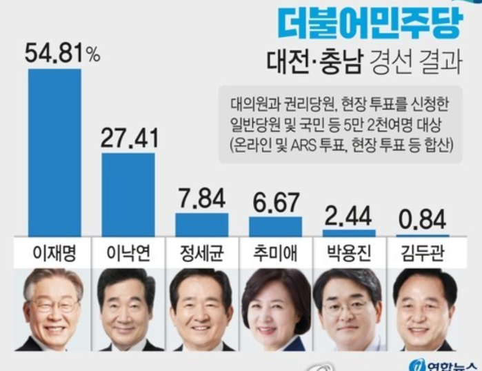 더불어민주당 대선후보 선출을 위한 첫 순회경선에서 이재명 후보가 54.81%로 과반 득표에 성공하면서 대세론 굳히기에 들어갔다. 반면 역전 발판 마련을 기대했던 이낙연 후보는 30% 벽도 넘지 못하면서 비상이 걸렸다. 4일 대전광역시 대전컨벤션센터에서 열린 대전·충남지역 선거인단 투표 결과에는 '이변'이 없었다.