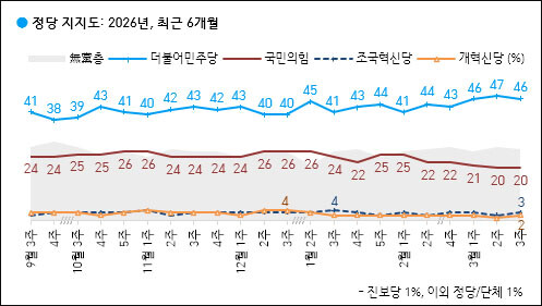 정당 지지율에서도 격차가 뚜렷했다. 더불어민주당은 46%, 국민의힘은 20%로 두 배 이상 차이가 났다. 중도층에서도 민주당 47%, 국민의힘 12%로 격차가 크게 벌어졌다.