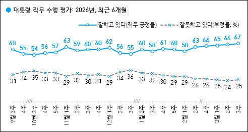 지지율은 58%에서 시작해 63%→64%→65%→66%→67%로 꾸준히 상승했다. 같은 기간 부정 평가는 29%에서 25%로 하락했다.