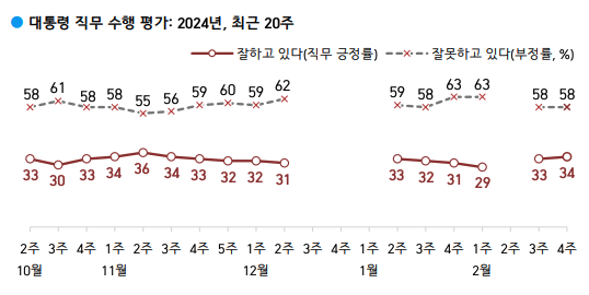 윤석열 대통령 지지율을 조사한 결과 전주보다 1%포인트 오른 34%로, 부정평가는 전주와 동일한 58%로 조사됐다.