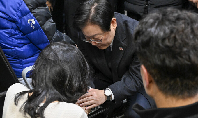 | ▲ 29일 더불어민주당 이재명 대표가 제주항공 여객기 폭발사고 탑승객 가족들을 위로하고 있다. (사진=연합뉴스) |