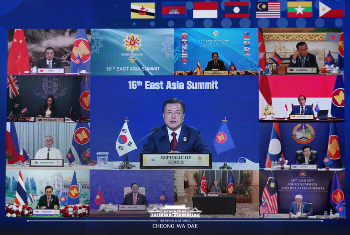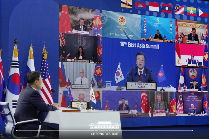 문재인 대통령은 27일저녁 화상으로 개최된 ‘제16차 동아시아정상회의(EAS, East Asia Summit)’에 참석했다. 이번 EAS는 아세안 9개국 정상들과 아세안 대화 상대국(미국, 중국, 일본, 러시아, 호주, 인도, 뉴질랜드) 정상들, 그리고 국제기구(WHO·WTO·아세안) 사무총장들이 참석한 가운데 EAS 차원의 공조 방안과 한반도 문제를 비롯한 주요 지역 국제 정세를 논의했다.