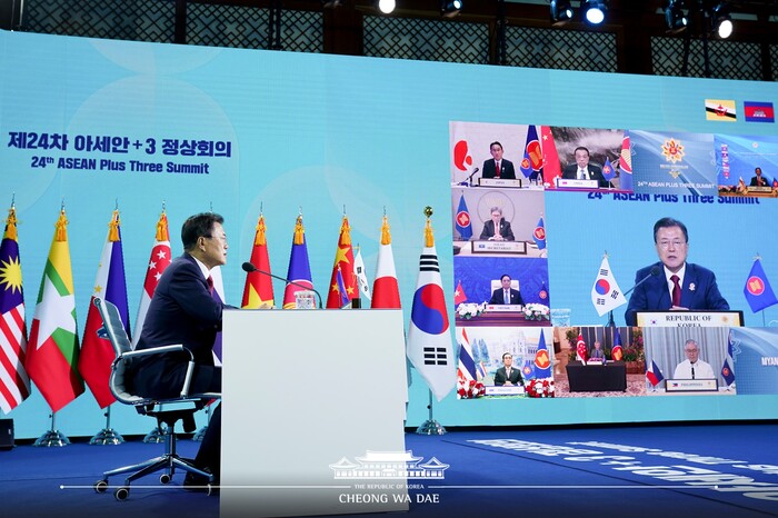 문 대통령이 이날 참석한 ‘아세안+3 정상회의’는 1997년 아시아 금융위기에 대한 공동 대응을 계기로 출범한 아세안 10개국 및 한·중·일 3국간 역내 회의체이다. 12개국 정상들은 코로나19 위기 상황에 대한 대응과 그간 협력의 성과와 향후 추진 방향에 대해 논의하고 역내 정세에 대해서도 의견을 교환했다.