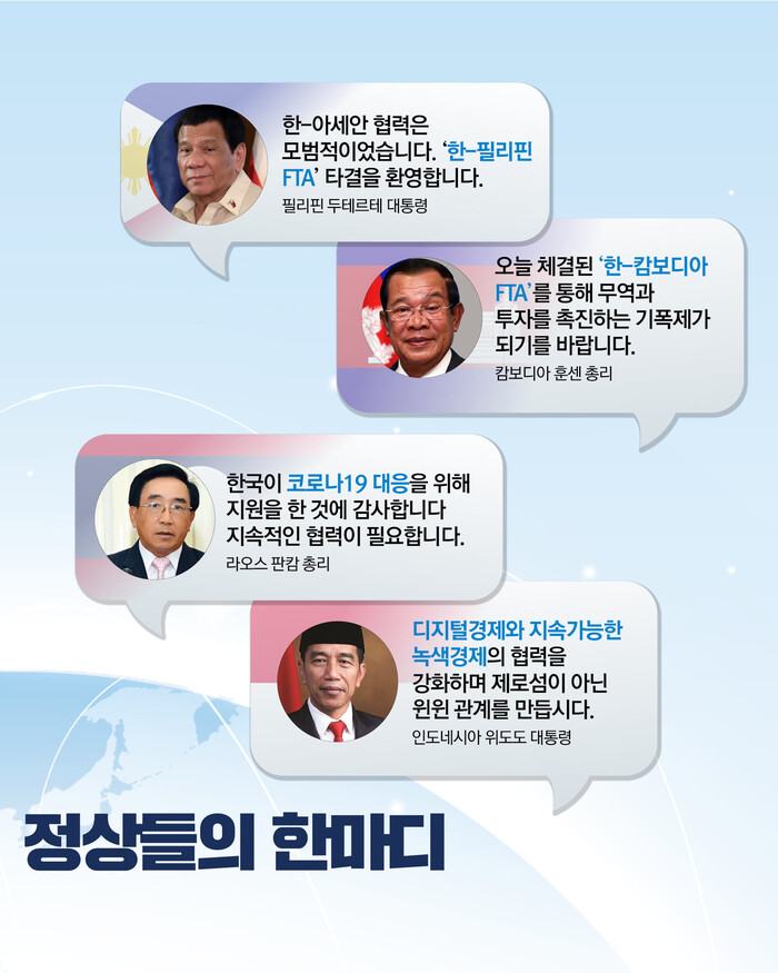 문재인 대통령은 또, 화상으로 개최된 ‘제22차 한-아세안 정상회의’에 참석해 신남방정책 협력 성과를 종합 점검하고 코로나19 위기 극복 및 한-아세안 협력 방안에 대해 논의했다. 정상들의 주요 발언이다.