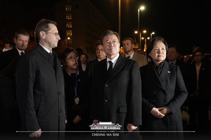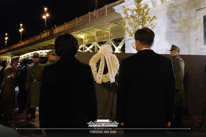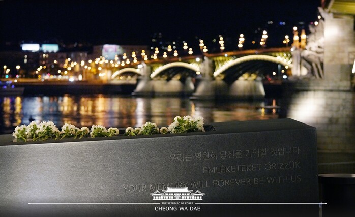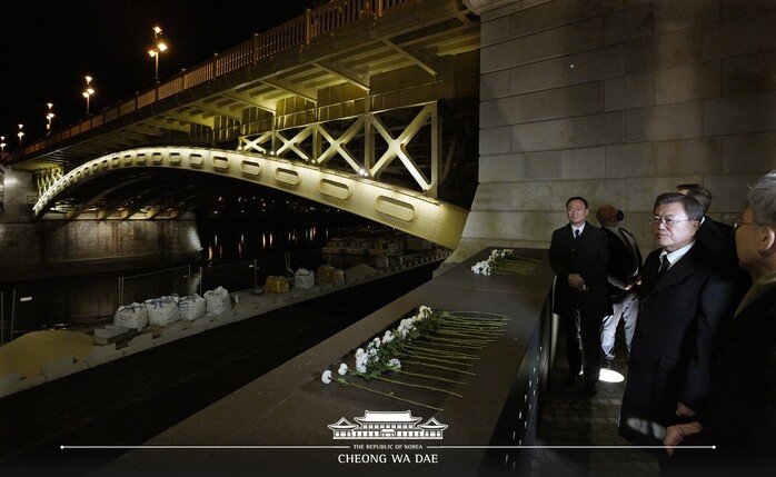 머르기트교 근처의 추모공간에서 진행된 행사에는 버르거 헝가리 부총리 겸 재무장관 등 헝사리 인사들도 참석했다. 검은색 정장을 갖춰 입은 문 대통령 내외는 ‘우리 국민의 영혼을 위로합니다’ 리본이 달린 화환을 추모비에 헌화했고, 참석자 일동은 군악대 연주에 맞춰 묵념을 하며 희생자들을 기리는 시간을 가졌다.