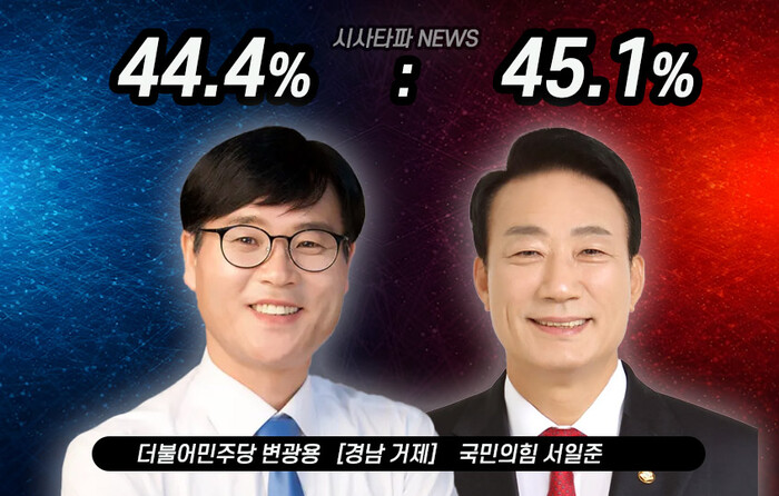 더불어민주당 변광용 후보는 44.4%, 국민의힘 서일준 후보는 45.1%로 7%p 격차로 초박빙 우세가 지속되는 가운데 개혁신당 김범준 후보가 4.2%를 기록했다.