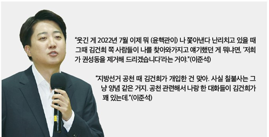 이 의원은 기자와의 대화에서 2022년 7월 국민의힘 당대표 시절 김 여사 측에서 '윤핵관' 중 한 명이었던 권성동 의원의 제거를 제안했다고 밝혔다고 전했다.