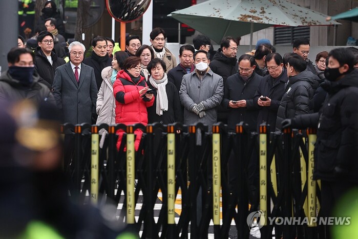 국민의힘 의원들이 6일 윤석열에 대한 고위공직자범죄수사처(공수처)의 체포영장 집행을 저지하기 위해 서울 용산구 한남동 대통령 관저 앞에 집결했다.