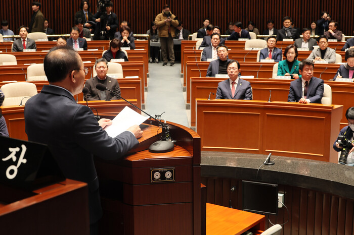 윤 권한대행은 의총 모두발언에서 "우리 당이 신속한 회복력을 가지기 위해서는 당내 구성원들이 허심탄회하게 소통하면서 다 같이 해결 방안을 찾는 데 함께해야 한다"며 "의원 개개인의 정치적 의견이 다양하겠지만 지금 가장 중요한 건 국민 기준에 맞춰 당이 변화해 나가야 한다는 점은 모두 같은 생각이실 것"이라고 밝혔다.
