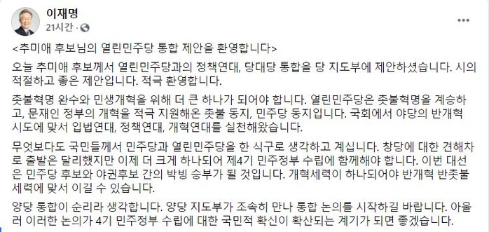 이 지사는 9일 자신의 페이스북에서 '추미애 후보님의 열린민주당 통합 제안을 환영한다'는 제목의 글을 올리고 "시의적절하고 좋은 제안"이라며 "적극 환영한다"라고 밝혔다.