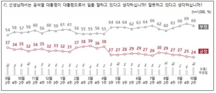 같은 조사에서 최저치는 직전 조사인 9월4주 조사로 당시 긍정평가는 25%였다. 윤 대통령의 국정운영에 대해 ‘신뢰하지 않는다’는 응답이 67%, 신뢰한다는 응답은 26%로 조사됐다.