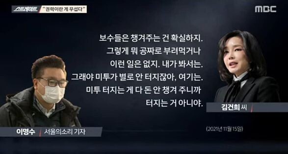 16일 저녁 MBC '스트레이트'가 방영한 국민의힘 대선후보 김건희씨가 본 매체의 기자와 통화한 내용이 "큰 한 방" 이 없었다는 소감이 나왔지만, 중도층은 물론 정치고관여층이 아닌 사람들은 충격이 컸다는 후문이 이어지고 있다.