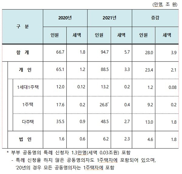 법인을 통한 종부세 부담회피 방지를 위한 과세강화로 법인의 과세인원이 6만2000명으로 279% 늘고 세액은 2조3000억 원으로 311% 크게 증가했다.