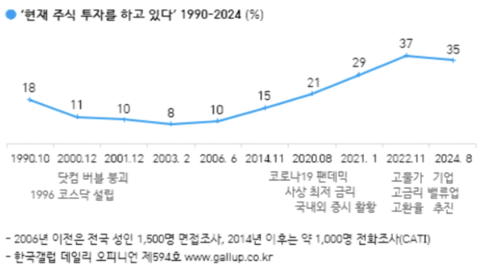 한국갤럽이 1990년부터 실시한 트레킹 조사에 따르면, 우리나라 주식 투자자들은 꾸준히 증가하는 것으로 나타나는데 2014년 11월 15%에서 → 2020년 8월 21% → 2021년 1월 29% → 2024년 8월 35%로 국민 10명 중 4명 정도가 주식을 하는 것으로 조사되었다.