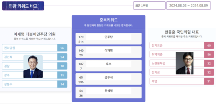| ▲지난 8월 3일에서 9일까지 빅데이터 분석툴인 스피치로그를 이용해 연관 키워드 분석을 한 결과, 한동훈 대표와 이재명 대표의 중복 키워드로 ‘금투세’가 보인다 (자료=스피치로그) |