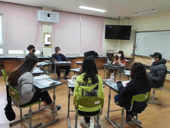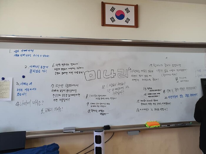 하지만 한국사 시간에는 전쟁·여성·인권 등을 배우고, 국어 시간에는 단편소설을 읽고 토론을 합니다. 영화를 보더라도 질문지를 만들어 칠판에 붙여놓고 둘러앉아 이야기를 나눕니다. 일상 기록해 시집을 내거나 벽화도 그립니다.