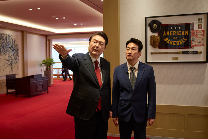 | ▲대통령실 건물을 소개하는 윤석열 대통령과 박장범 앵커 (사진=연합뉴스) |