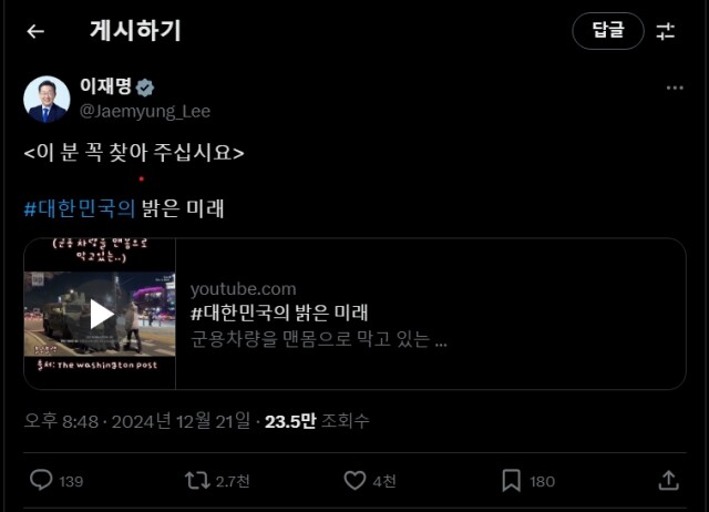 이 대표는 이날 엑스 계정에 ‘대한민국의 밝은 미래’라는 해시태그와 함께 “이 분을 꼭 찾아 주십시오”라고 적었다. 이 대표가 첨부한 영상에서 4명의 시민은 운행하고 있는 장갑차를 맨몸으로 막아섰다.