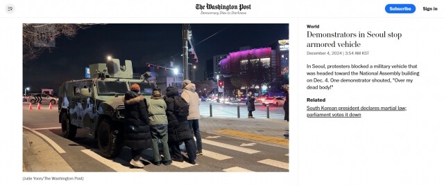 | ▲ 12월 3일 비상계엄 사태 당시 장갑차를 막아서고 있는 시민 (출처=워싱턴포스트) |