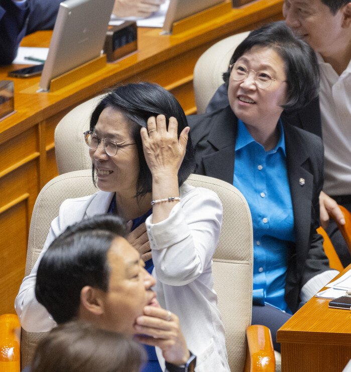 | ▲ 국회 과학기술정보방송통신위원회 최민희 위원장과 민주당 간사인 김현 의원이 21일 서울 여의도 국회 본회의에서 방송문화진흥회법 일부개정법률안이 통과되자 기뻐하고 있다. 2025.8.21 (사진=연합뉴스) |