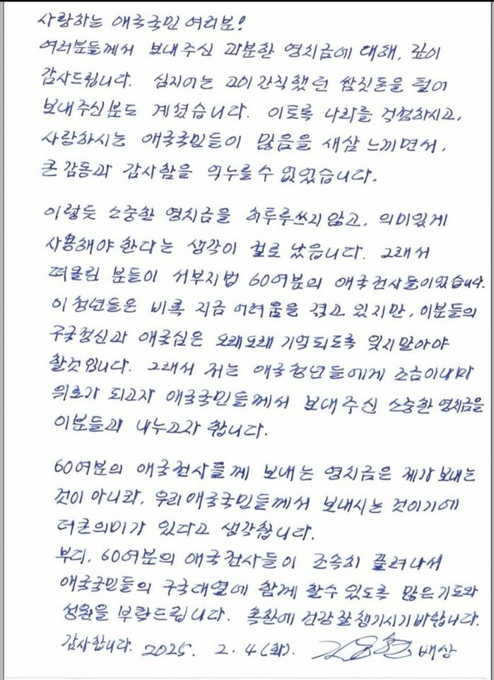 | ▲ 4일 김용현이 극우들에 보낸 손편지 (출처=커뮤니티) |