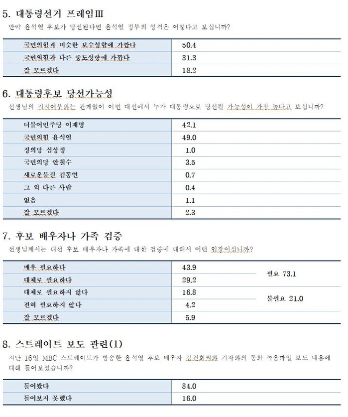 이재명 37.5 %, 윤석열 43.8%, 안철수 9.8%, 심상정 2.1%, 김동연 0.5%