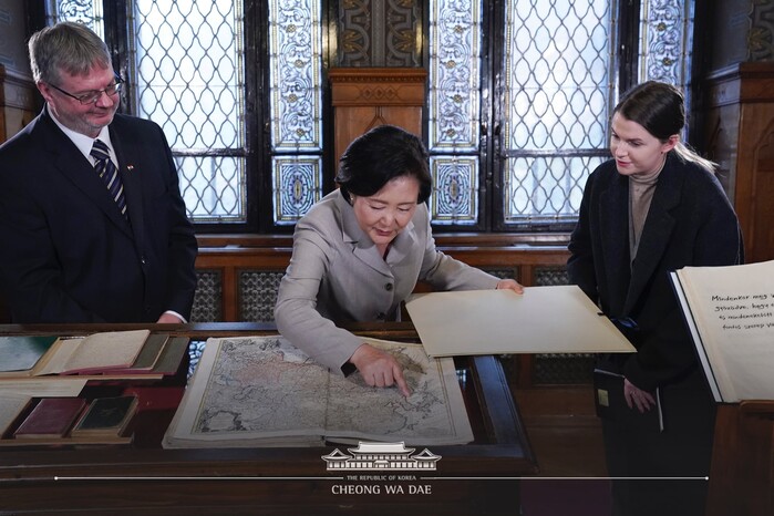 김정숙 여사는 헝가리 국빈 방문에서 “한지로 복원되는 이탈리아 레오나르도다빈치 미술품", "120년 전 헝가리 신부가 본 조선의 미래", "동해가 표시된 1730년도 지도" 를 만났다.
