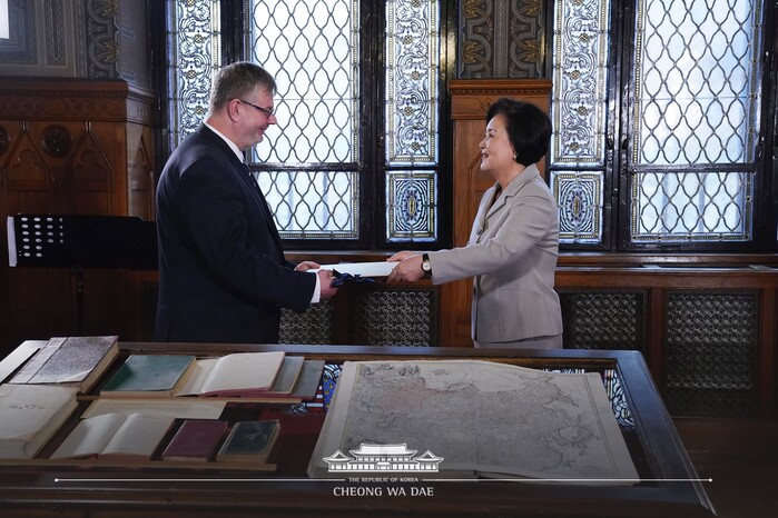 이날 양국 국가기록원은 기록물 복제복원과정 기술도 시연 소개했다. 한국 국가기록원은 <조선왕조실록> 「세종장헌대왕실록」을 전통 방식으로 복제, 능화문을 재현한 표지 제책으로, 우리나라의 기록보존 기술과 한지의 우수성을 알렸고, 김정숙 여사는 이 복제본(「오례(五禮)」 중 가례<嘉禮, 궁중의 혼례>로 구성) 1권)을 헝가리에 선물했다.