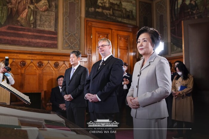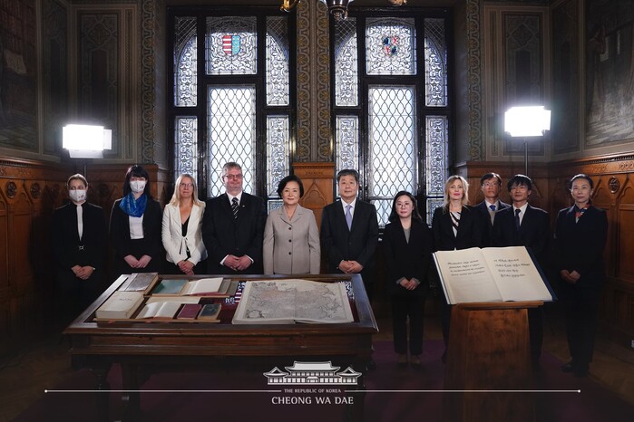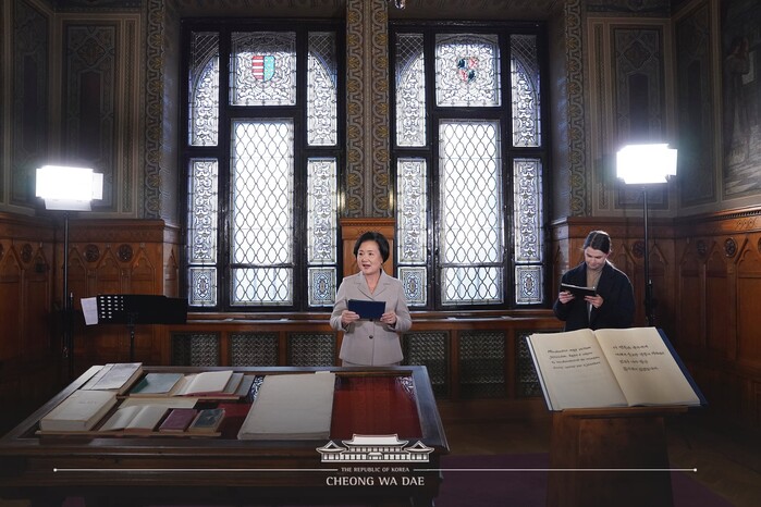 김정숙 여사는 “헝가리 국가기록원이 소장한 3,000km의 기록 속에서 한국의 과거와 오늘을 잇는 기록을 찾아내 준 연구자들께 감사의 마음을 드린다” 고 인사했다.