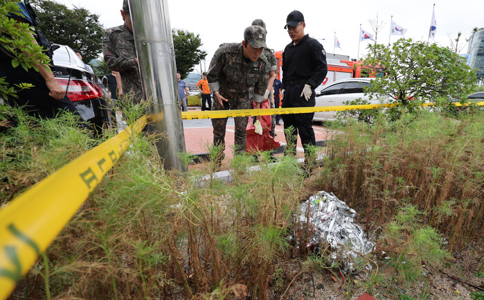 소방과 경찰은 20일 오전 관련 신고를 받고 출동해 오물 풍선 잔해가 발견된 청사 정문 주차장 가장자리를 통제했다.