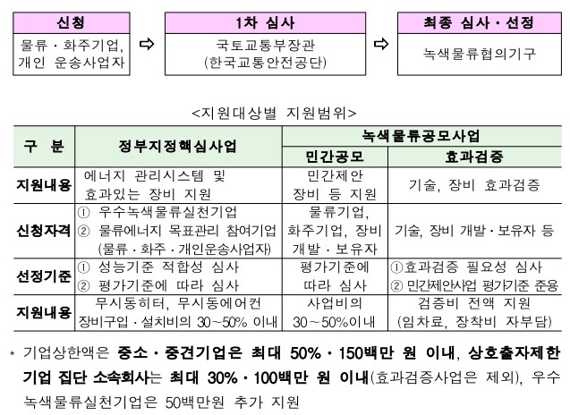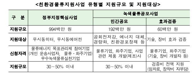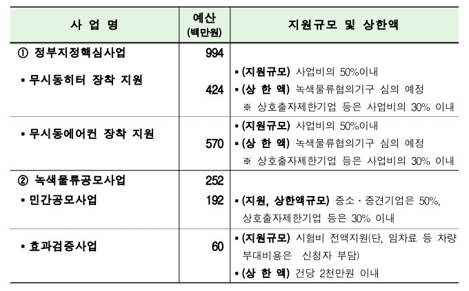 정부지정핵심사업은 온실가스 감축과 미세먼지 저감에 효과가 높아 대중화된 무시동 히터, 무시동 에어컨 장착에 약 10억 원을 지원하고, 녹색물류공모사업은 연료절감 효과가 검증되어 대중화가 진행 중인 장비 설치를 지원하는 민간공모(1.92억원)와, 연료절감 효과 검증이 필요한 장비의 검증시험을 지원하는 효과검증(0.6억원)에 2.5억원을 지원한다.