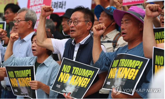 | ▲ 한미 관세협상이 타결된 31일 서울 광화문 미국대사관 인근에서 트럼프위협저지공동행동 및 농민의길 관계자들이 입장발표 기자회견을 마친 뒤 구호를 외치고 있다. 2025.7.31 (사진=연합뉴스) |