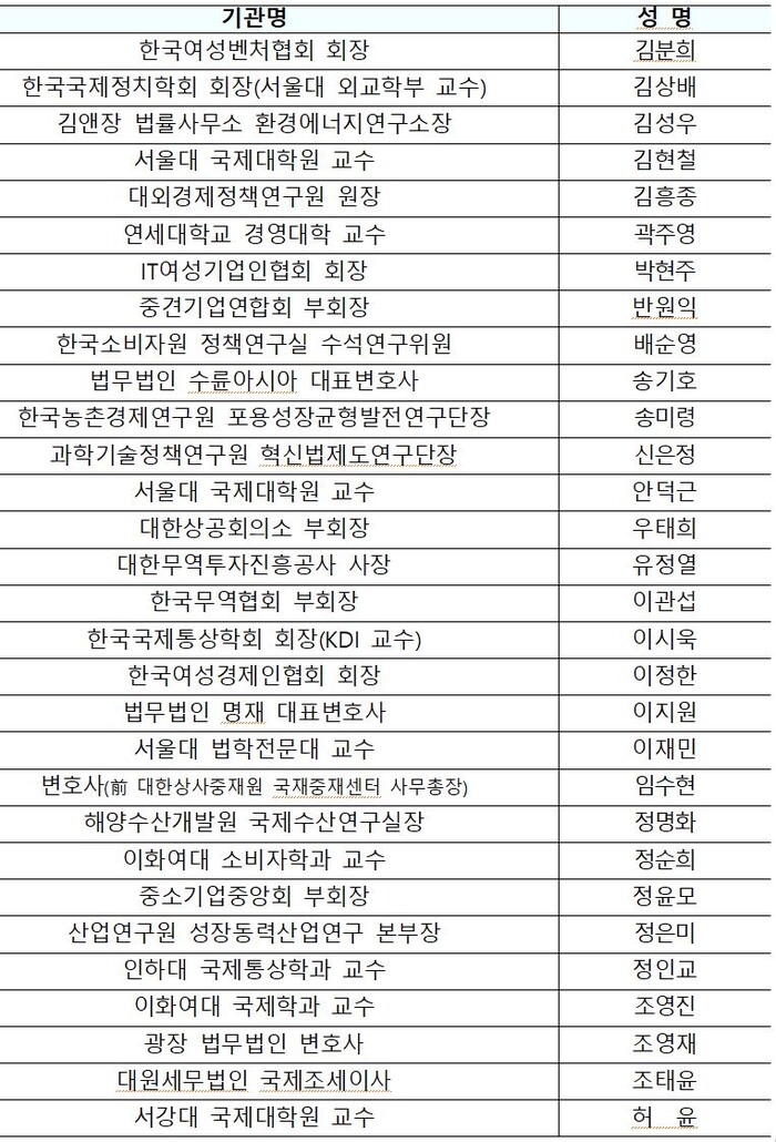 | ▲ 통상교섭민간자문위원 명단 |