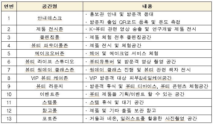 -중소화장품 기업의 제품들을 종합적으로 전시, 체험, 홍보하기 위한 공간,