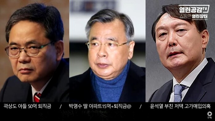 | ▲열린공감TV, 화천대우가 핵심인사들에게 50억원씩 챙겨주었다는 이른바 '50억 클럽' 소문이 무성, 윤석열 전 검찰총장도 부친저택 고가매입으로 의혹제기가 되고 있다. |