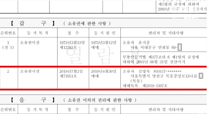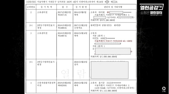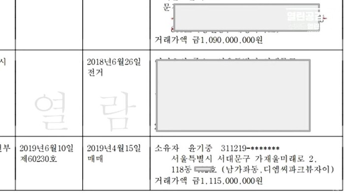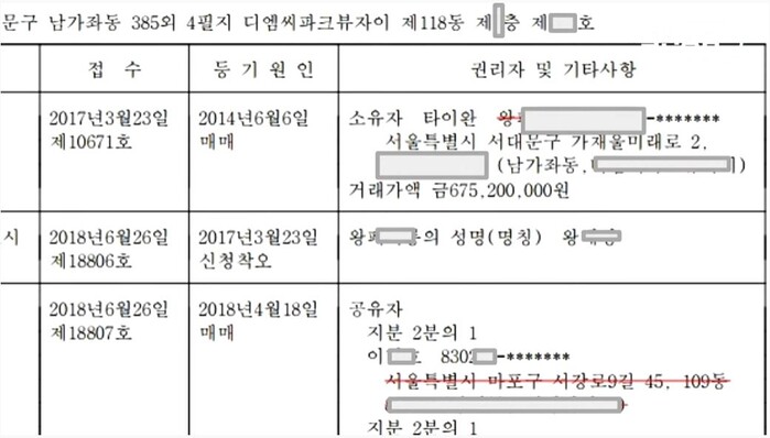 | ▲ 열린공감tv, 부친 윤기중씨 2500만원만 더해서 디엠씨파크뷰자이 매입. 최초매입자 타이완사람. |
