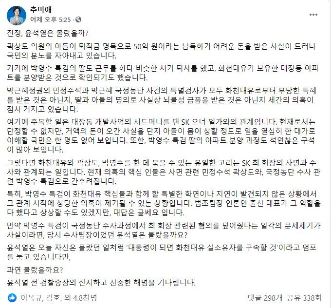 추 후보는 "거액의 돈이 오간 사실을 아들의 몸이 상할 정도로 일을 열심히 한 대가" 로 이해할 국민은 한 명도 없어 보인다. 박영수 특검 딸의 아파트 분양 과정도 석연찮은 구석이 많아 보인다. 현재 의혹의 핵심 인물은 사면 관련 민정수석 곽상도와 국정농단 수사 관련 박영수 특검으로 간추려진다고 했다.