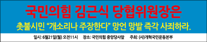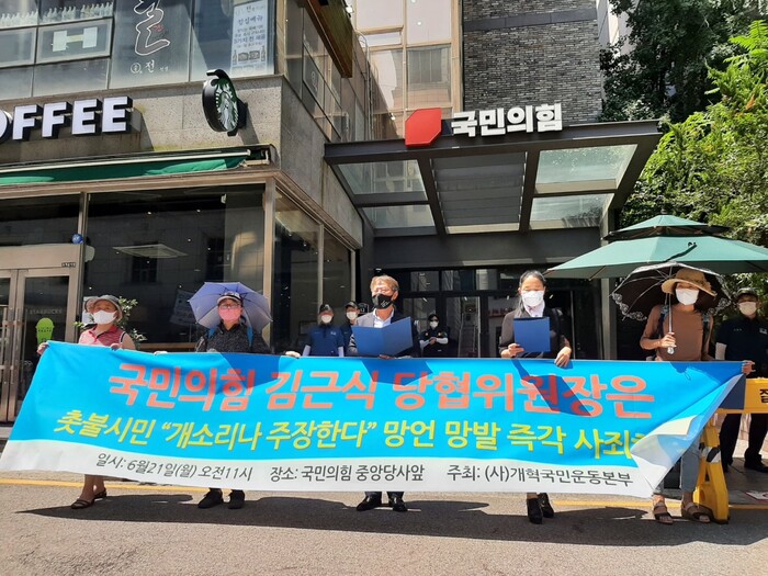 이에 6월 21일(월) 오전 11시 국민의 힘 중앙당사 앞에서, (국민의 힘 김근식 당협위원장은 촛불 시민 “개소리나 주장한다” 망언 망발 즉각 사죄하라) 기자회견을 하였다.