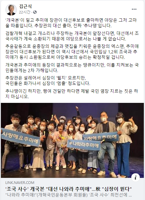 국민의힘 김근식 위원장(송파병 당협위원장)은 2021년 6월 13일 페이스북에서 "개국본"이 밀고 추미애 장관이 대선후보로 출마하면 야당은 그저 고마울 따름입니다. 검찰개혁 내걸고 개소리나 주장하는 “개국본”이 앞장선다면 대선에서 조국사태가 계속 소환되기 때문에 야당으로서는 나쁠 게 없습니다. 라는 망언을 하였다.