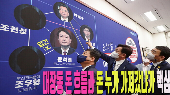지금도 민생이 어려운데 대장동 문제로 너무 논란이 돼서 국민 여러분께 송구스럽다는 말씀을 드립니다. 복잡한 내용을 정리하기 위해서 저희들이 백드롭을 이렇게 만들어봤습니다. 사안이 복잡하지만 저희들의 핵심 주장은, 국민들이 생각했을 때도 그럴 것입니다. ‘누가 무슨 말을 했다, 녹취록이 어쨌다’ 이것이 중요한 것이 아니라 돈이 말해 주는 것 아니겠습니까.