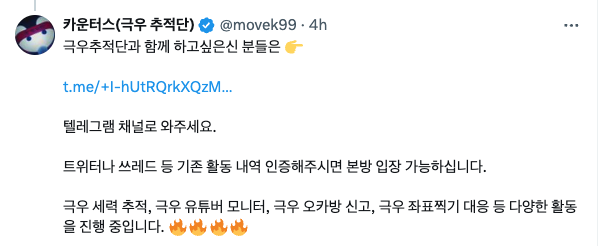 극추추적단 신청 링크는 다음과 같다. https://t.me/+I-hUtRQrkXQzMzc1