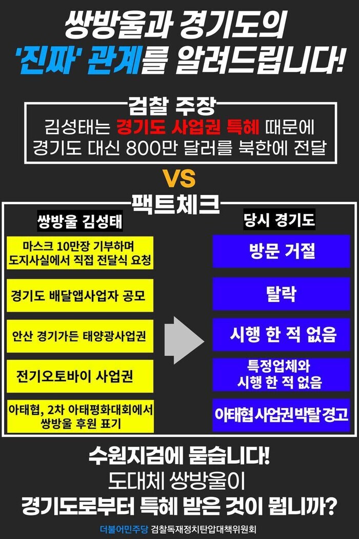 민주당은 수원지검이 이재명 대표에게 죄를 덮어씌우기 위해 해당 의혹 핵심 피의자인 김성태 전 쌍방울 그룹 회장의 특정경제범죄가중처벌법상 재산국외도피 혐의, 남북교류협력에 관한 법률 위반 혐의를 제대로 수사하지 않는다고 의심하고 있다.