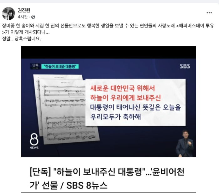 | ▲ 17일 '해파버스데이 투유' 원곡을 부른 권진원의 게시글 (출처=권진원 페이스북) |