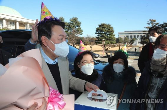 | ▲ 2021.12.18 당시 국힘 대선 후보였던 윤석열이 지지자가 준 생일 케잌을 받고 기뻐하고 있다 (사진=연합뉴스) |