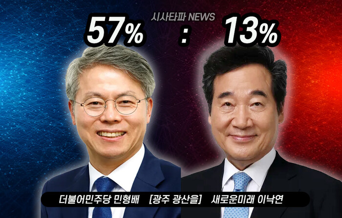 광주 광산을 현역인 민형배 의원이 자신의 지역구에 도전한 새로운미래 이낙연 대표를 4배 이상 앞서며 압도하고 있다.