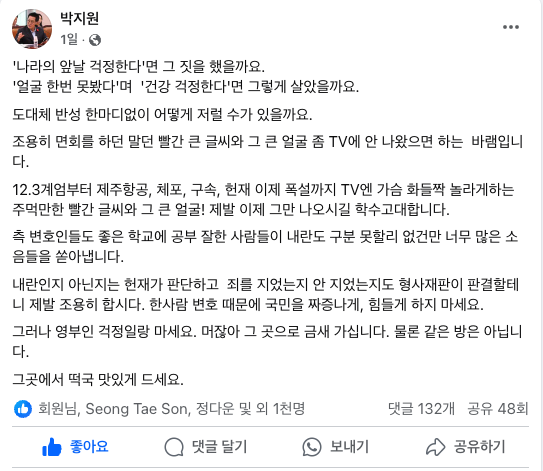 그는 “미우나 고우나 국민의 손으로 뽑은 대통령이다. 명절 당일, 폭설에도 서울구치소 앞을 지키는 지지자들 역시 우리가 품어야 할 국민”이라며 “상처 입은 국민의 마음을 위로하고 분열된 국론을 봉합시켜야 할 공당의 정치인의 발언이 이토록 경망스럽고 가벼워서야 되겠나”라고 날을 세웠다.