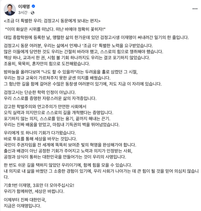 이재명 더불어민주당 대선 후보는 30일 자신의 SNS에 ‘조금 더 특별한 우리: 검정고시 동문에게 보내는 편지’라는 제목의 글을 올리고 지지를 호소했다.