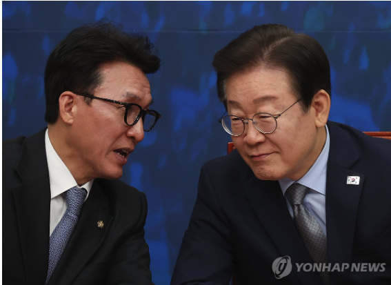 | ▲ 더불어민주당 이재명 대표가 15일 국회에서 열린 최고위원회의에서 김민석 최고위원과 대화하고 있다.2024.11.15 (사진=연합뉴스) |